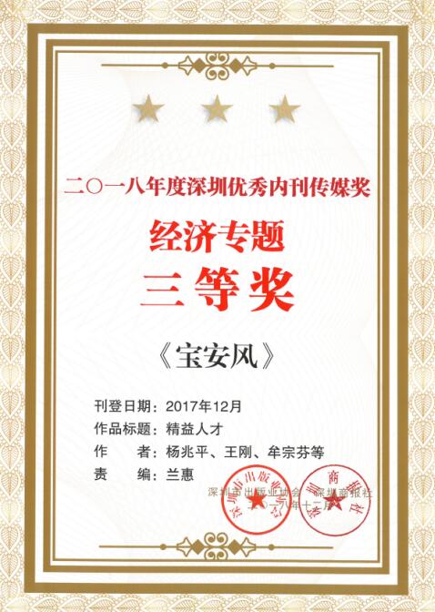 深圳内刊年度综合奖“优秀内刊传媒奖”,由市出版业协会、深圳商报联合组织深圳市新闻出版广电局等资深文化传媒专家评定,每年评选一次,代表着深圳内刊的最高荣誉。《宝安风》在强手林立的深圳内刊界再接再厉,再次获评“深圳优秀内刊传媒奖”之“十佳企业刊奖”。同时,282期“精益人才专题”获“经济专题”三等奖,286期卷首《鲜衣怒马少年时》获评“卷首语”二等奖,283期通讯“宝安三十年 回首皆芳华”获评“好通讯”三等奖。